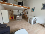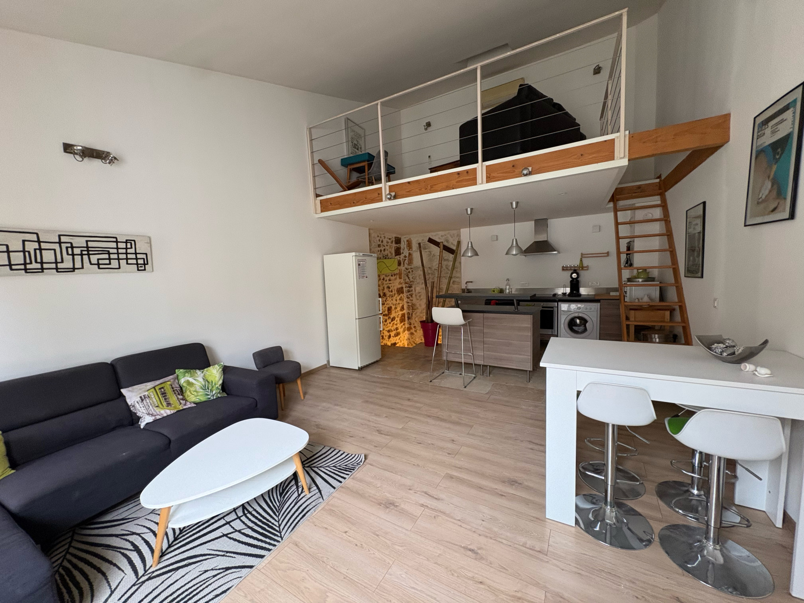 Au premier étage un vaste séjour avec cuisne américaine équipée et aménagée ainsi qu'une mezzanine pouvant servir de bureau ou chambre d'amis .