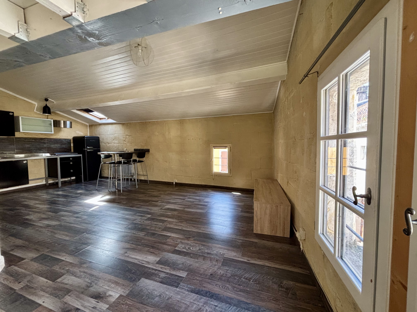 Grand studio au 2ème et dernier étage d'une surface de 38m2, plus sa mezzanine de 7m2, en excellent état composé, d'un large séjour de 35m2 avec rangements et sa cuisne US équipée, d'une salle d'eau avec douche à l'italienne et wc, ainsi qu'un coin nuit avec mezzanine de plus 7m2.