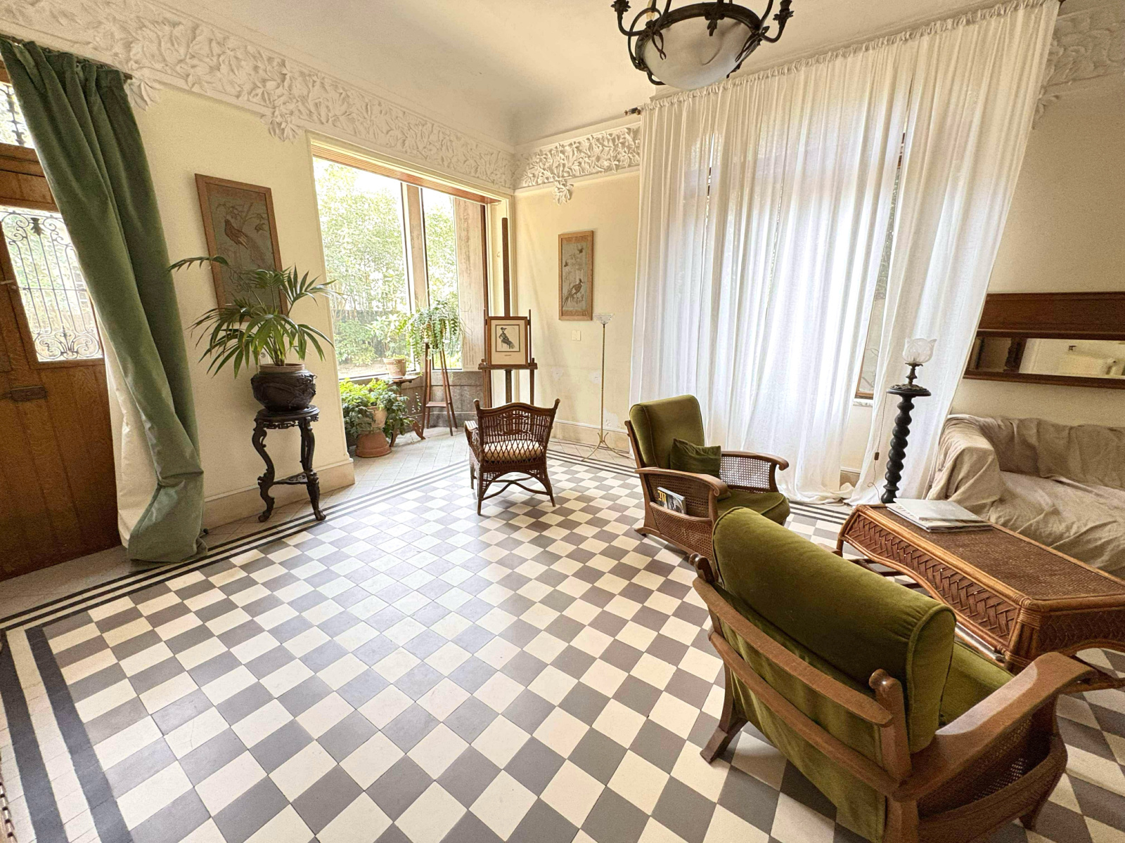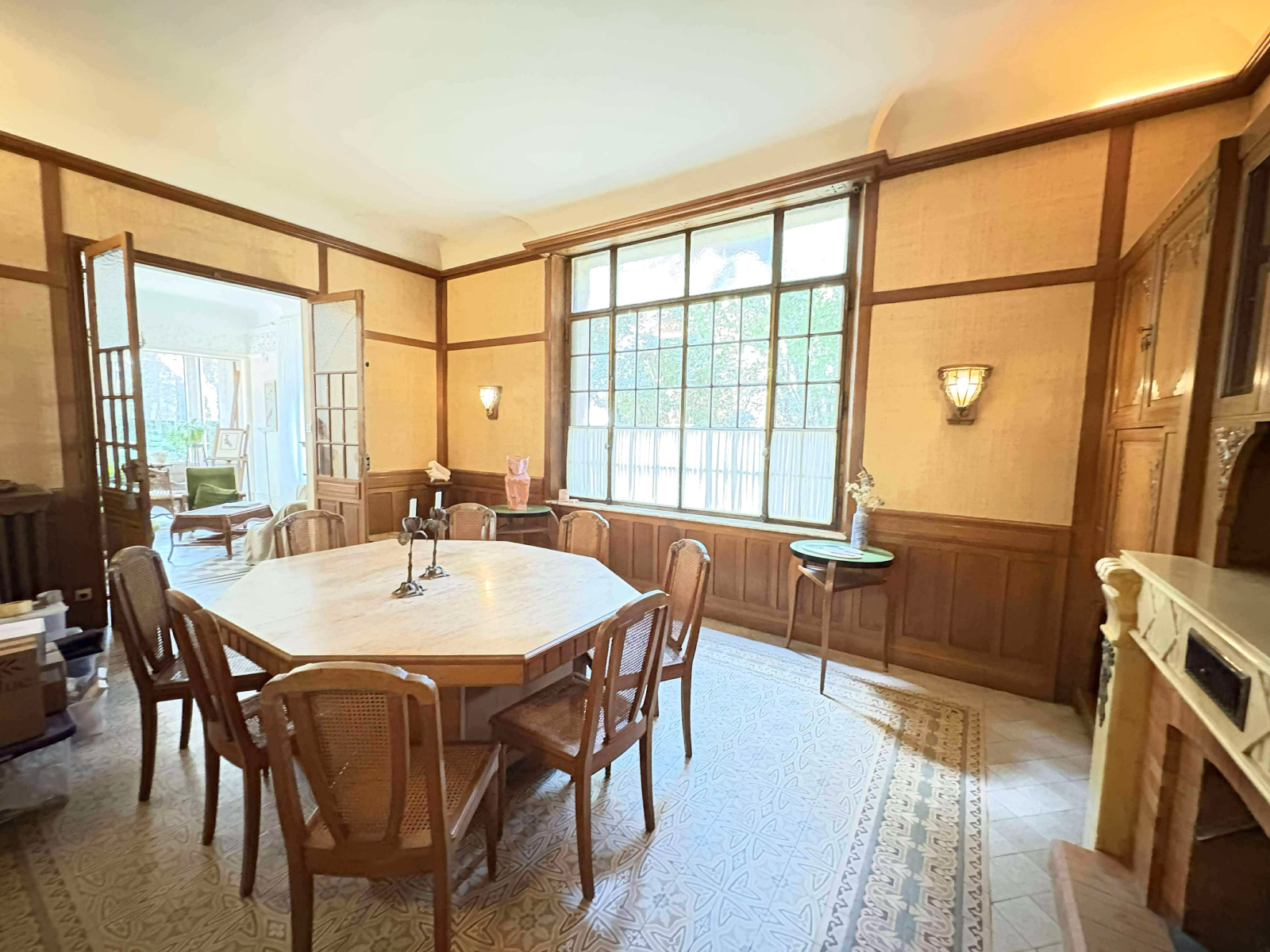 Cette bâtisse de 1925 s'élève sur 3 niveaux et dispose en rez-de-chaussée de grands espaces de vie (salon, salle à manger, cuisine) avec des sols et plafonds d'époque.