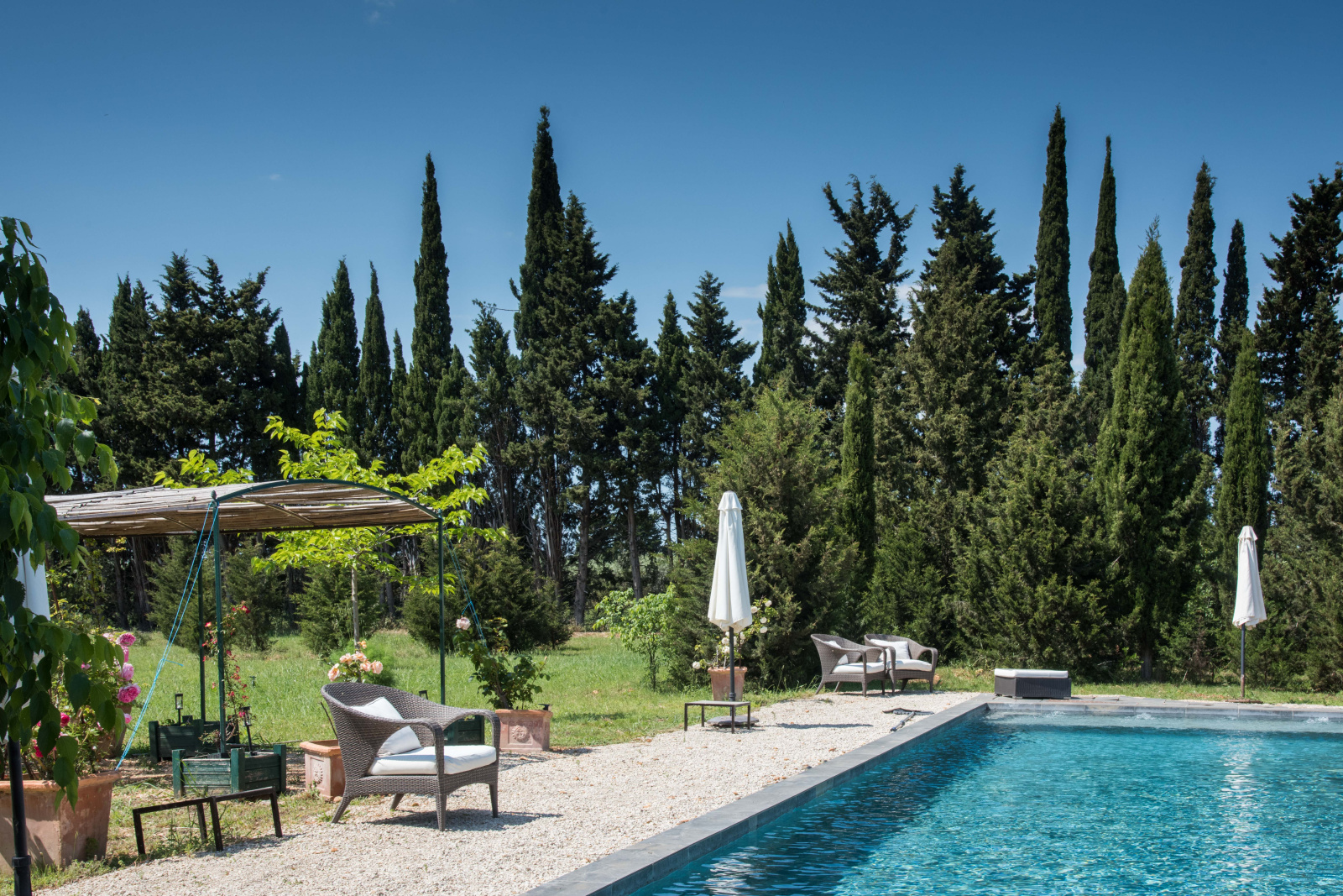 Les extérieurs proposent plusieurs coin terrasse ainsi qu'une piscine 17mx6m pour profitez des beaux jours.
